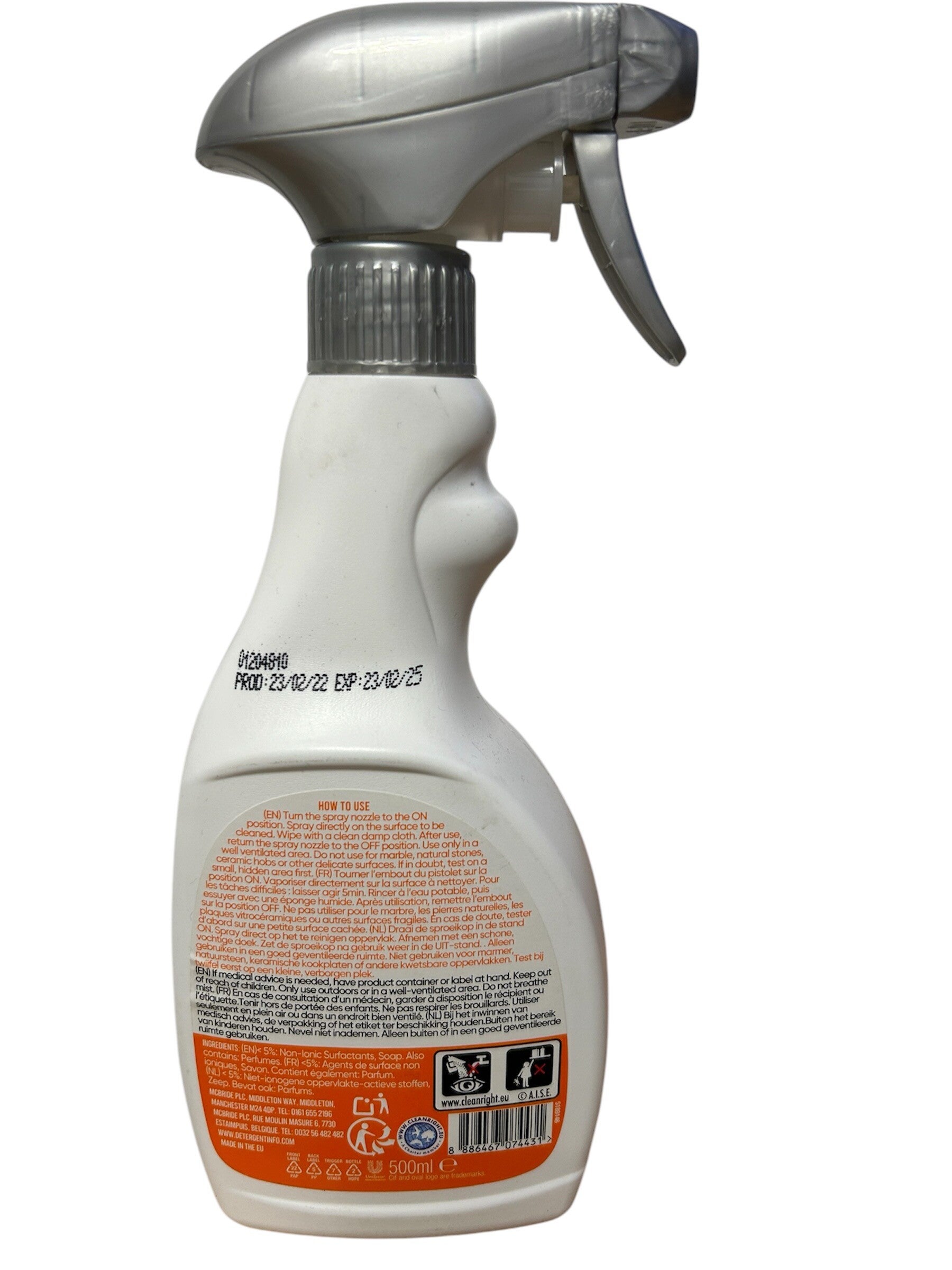 MODE D'EMPLOI: Tournez l'embout du pistolet sur la position ON. Vaporiser directement sur la surface à nettoyer. Pour les taches difficiles: laisser agir 5mn. Rincer à l'eau potable, puis essuyer avec une éponge himide. Après utilisation, remettre l'embout sur la position OFF. Ne pas utiliser pour le marbre, les pierres naturelles, les plaques vitrocéramiques ou autres surfaces fragiles. En cas de doute, tester d'abord sur une petite surface peu visible.