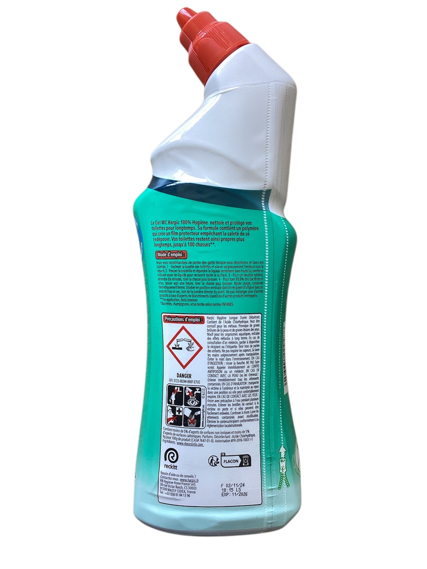 Le Gel WC Harpic 100% Hygiène nettoie et protège vos toilettes pour longtemps. Sa formule contient un polymère qui crée un film protecteur empêchant la saleté de se redéposer. Vos toilettes restent ainsi propres plus longtemps, jusqu'à 100 chasses**.