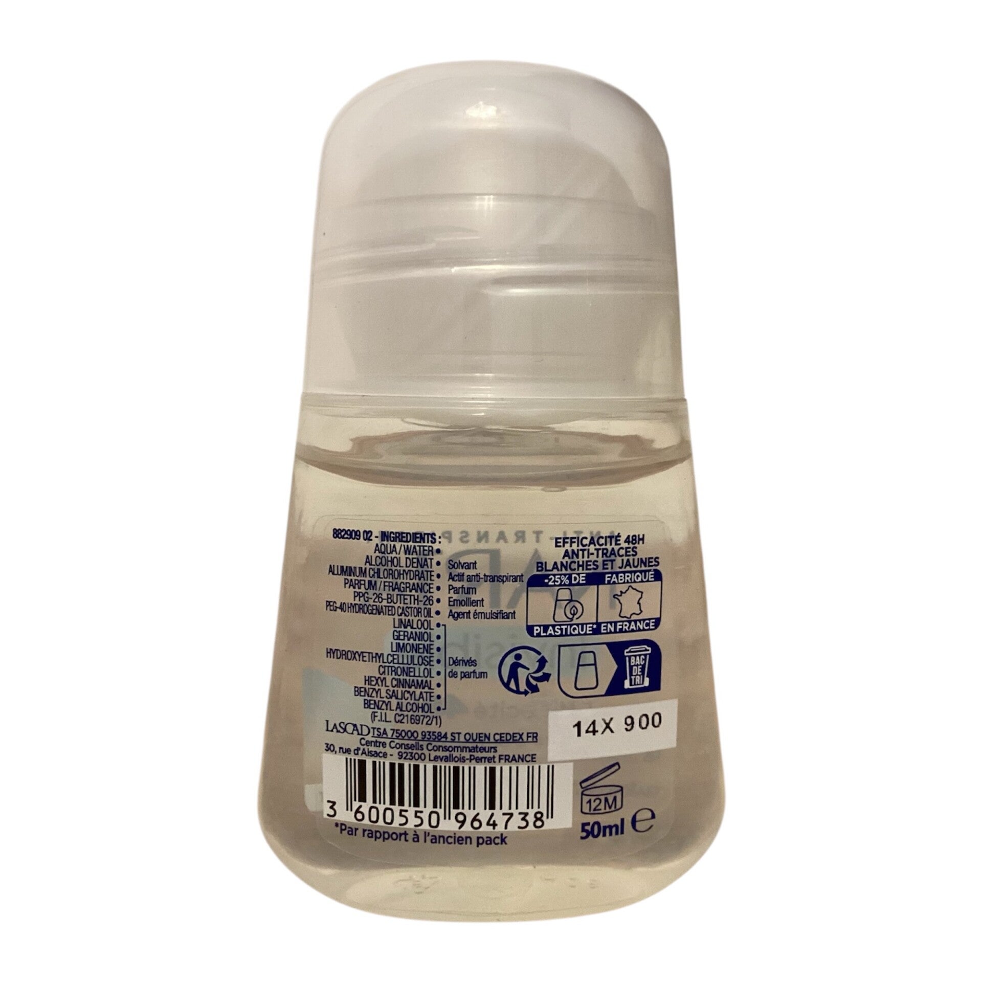 Détails: Ce déodorant en bille contient des agents invisibles qui protègent des mauvaises odeurs pendant 48h, sans laisser de traces blanches ou jaunes sur la peau ou sur les vêtements.