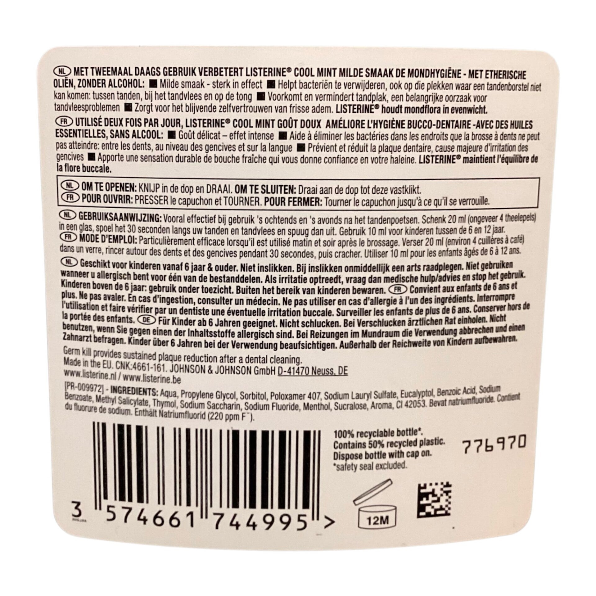 Aqua, Propylene Glycol, Sorbitol, Poloxamer 407, Sodium Lauryl Slfate, Eucalyptol, Benzoic Acid, Sodium Benzoate, Methyl Slicylate, Thymol, Sodium Saccharin, Sodium Fluoride, Menthol, Sucralose, Aroma, CI 42053. Bevat Natriumfluoride. Contient du fluorure de Sodium. Enthalt Natriumfluorid (220 ppm F).